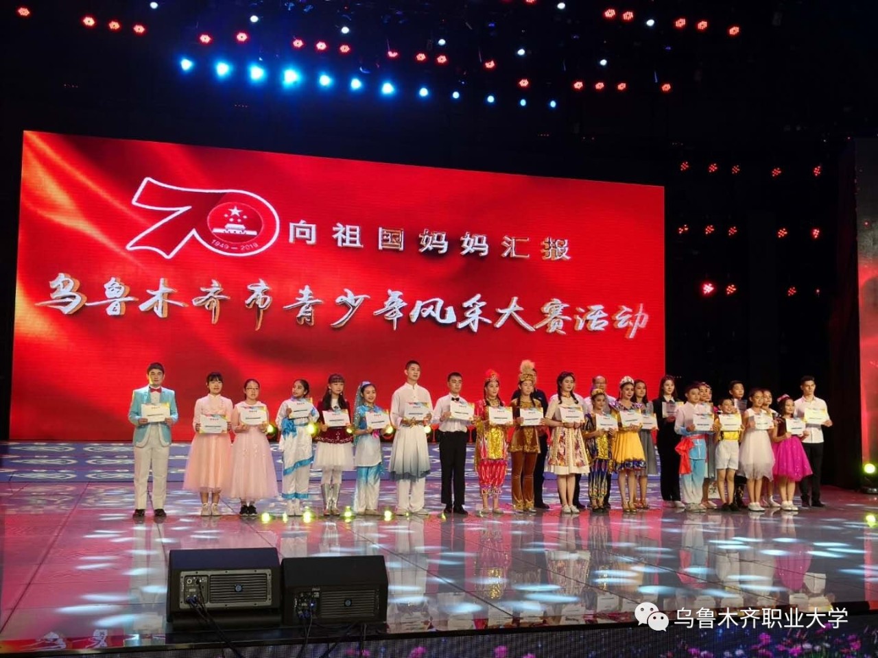 “向祖国妈妈汇报”—乌鲁木齐市青少年风采大赛活动是由乌鲁木齐市委宣传部主办,市教育局承办,由各区县教育局、各学校进行初赛复赛选拔,最终49名优秀选手脱颖而出,参加市级决赛。我校选派的外国语学院应用俄语1806班迪拉来·阿布都荣获三等奖。由学校团委大学生艺术团48名各族学生表演的大型舞蹈“民族团结一家亲”获优秀表演奖。